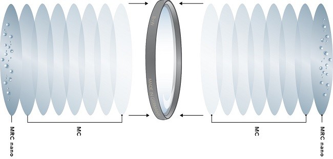 - Lớp tráng phủ đặc biệt này khiến nước lập tức lăn khỏi bề mặt kính lọc, đẩy lùi bụi bẩn có thể bám dính và đặc biệt bền vững giúp tránh khỏi mọi trầy xước có thể có trên bề mặt kính lọc. Công nghệ MRC giúp tránh bóng mờ hoặc hình ảnh kép có thể xuất hiện trong ảnh gây ra bởi sự phản xạ trở lại của cảm biến hình ảnh.